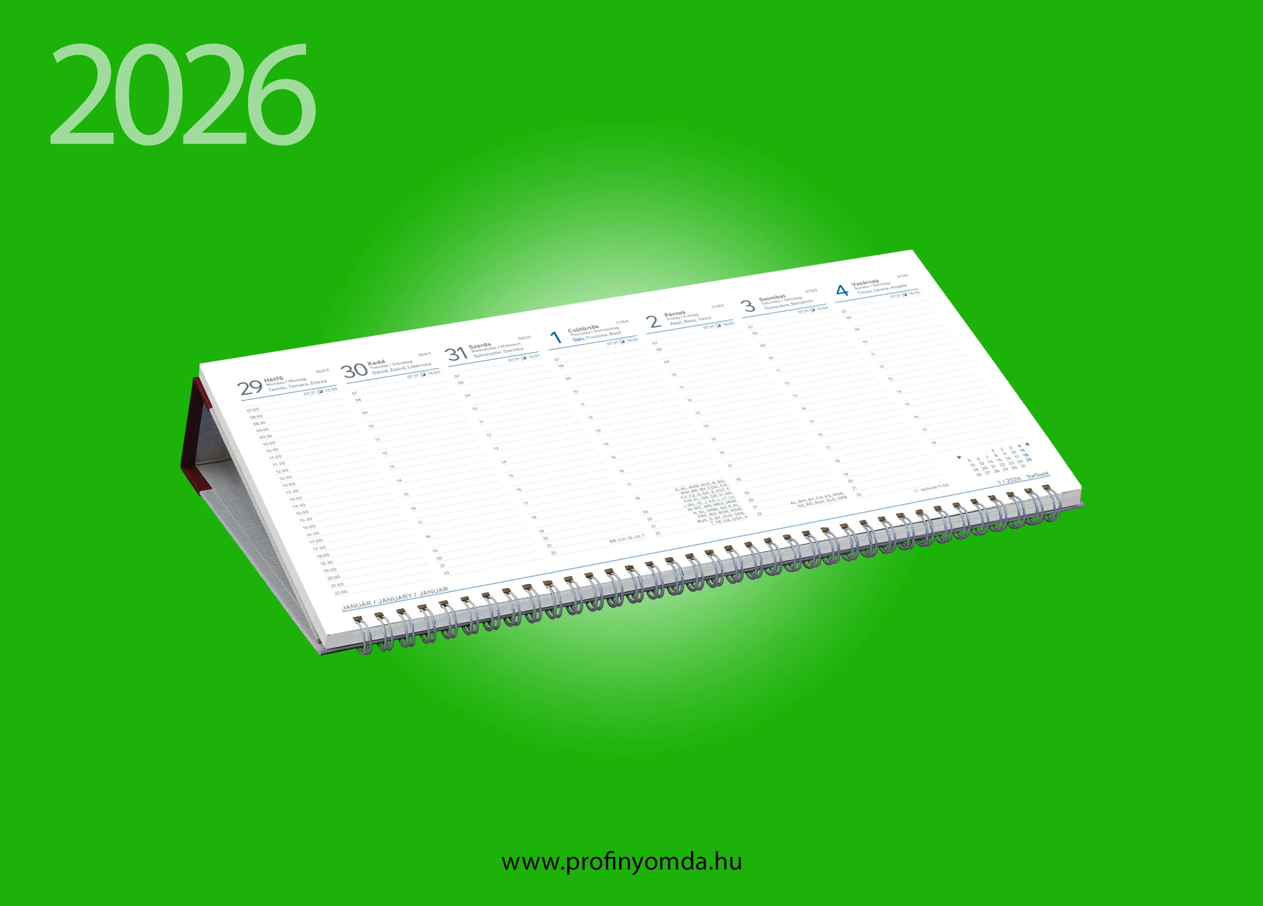 • 30 lap, háromnyelvű naptárrész, névnapok