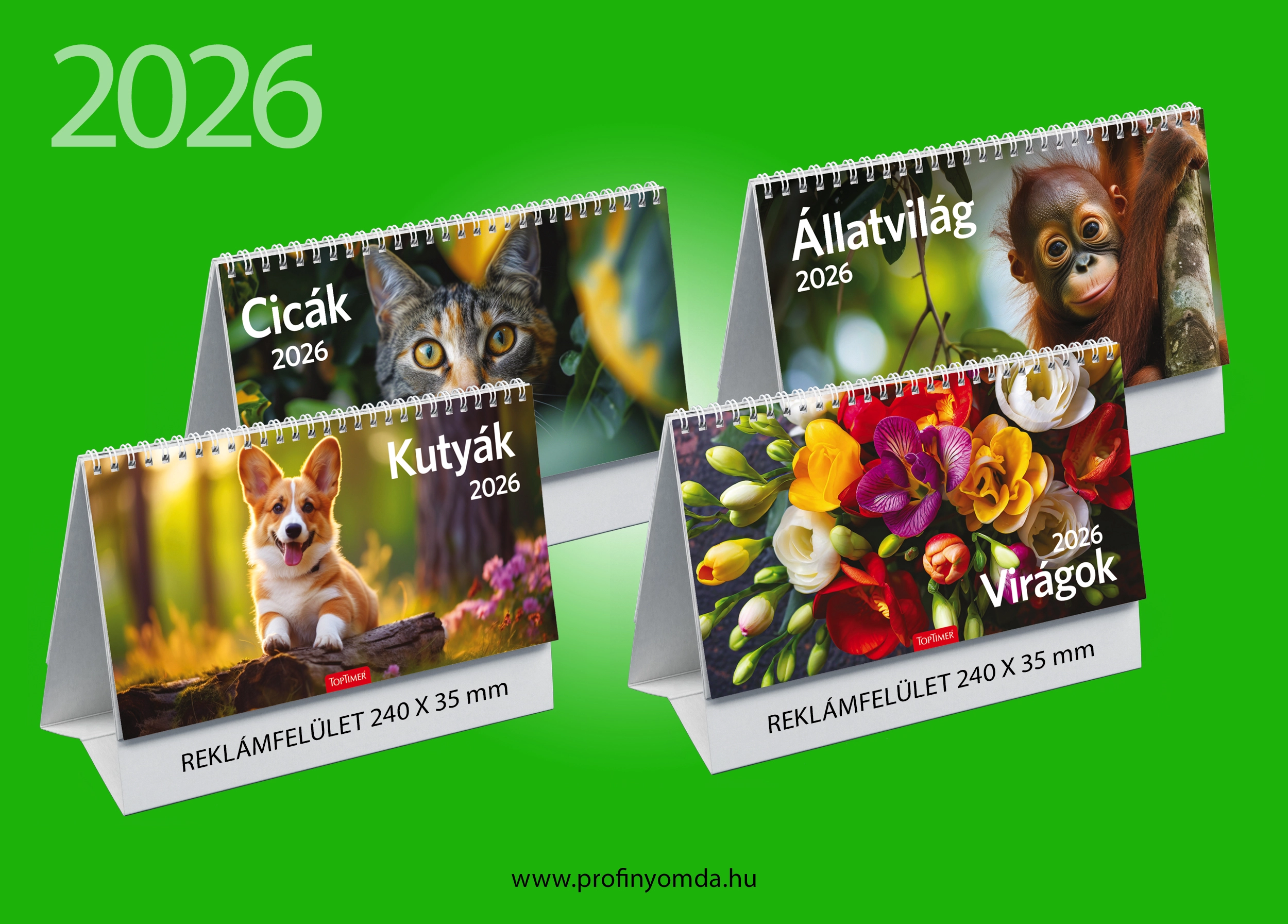 Papírtáblás, álló asztali naptár négyféle témával.